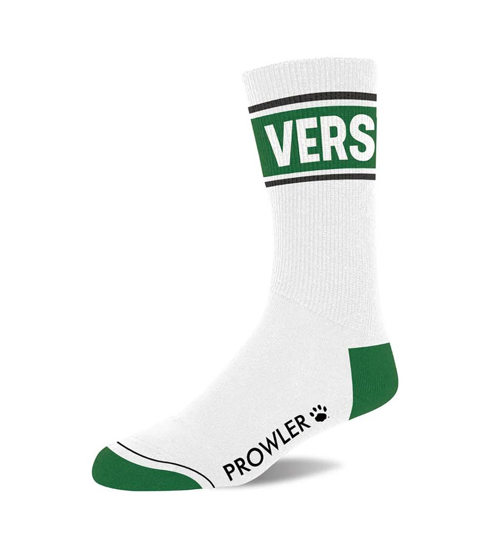 The Prowler Vers Socks are a solid white color with the word VERS displayed on the sock band, and green tips on the heel and toes for added flair. These socks feature a Prowler logo along the sole, and they're perfect to wear with any outfit. Let potential new suitors know how versatile you can be when it comes to pleasure. These socks are excellent conversation starters and so comfortable that you'll want to wear them everywhere.